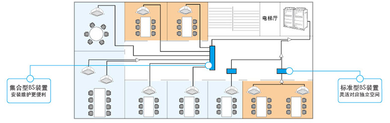 VRV自由冷暖系列通過(guò)追加BS裝置及吸入氣管,可實(shí)現(xiàn)在一套空調(diào)系統(tǒng)內(nèi)的同時(shí)制冷制熱運(yùn)轉(zhuǎn),充分配合各種建筑中的人性化冷熱需求。兩種BS配件選擇,大幅度提高設(shè)計(jì)靈活性:標(biāo)準(zhǔn)型BS裝置和集合型8S裝置可滿(mǎn)足不同的設(shè)計(jì)要求,標(biāo)準(zhǔn)型BS可靈活對(duì)應(yīng)獨(dú)立空間,集合型BS可使系統(tǒng)安裝維護(hù)更便利。
